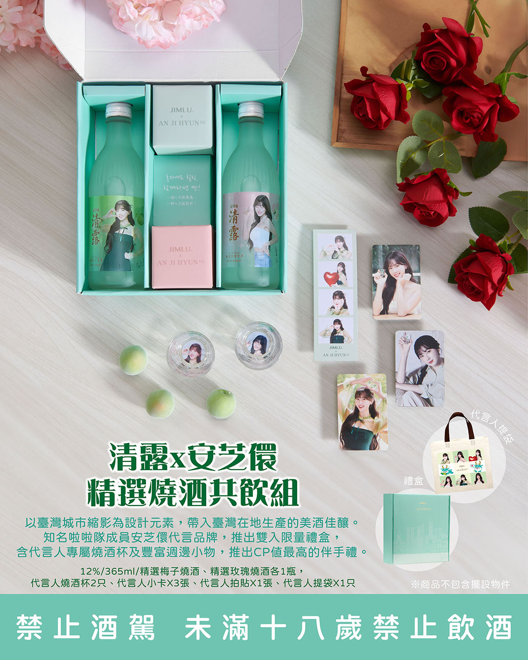 酒精濃度:12% 容量:365ml 精選梅子燒酒、精選玫瑰燒酒各1瓶,附代言人燒酒杯2只、代言人小卡X3張、代言人拍貼X1張、代言人提袋X1只